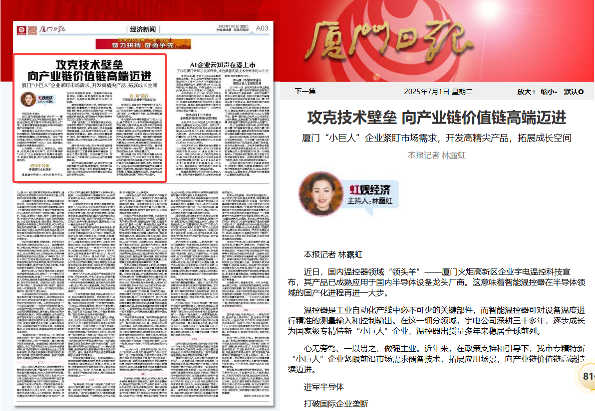 7月1日,《廈門(mén)日?qǐng)?bào)》在報(bào)道宇電新突破的頭條報(bào)道中提到,國(guó)內(nèi)溫控領(lǐng)域“領(lǐng)頭羊”宇電的產(chǎn)品已成熟應(yīng)用于國(guó)內(nèi)半導(dǎo)體設(shè)備龍頭廠(chǎng)商。這意味著智能溫控器在半導(dǎo)體領(lǐng)域的國(guó)產(chǎn)化進(jìn)程再進(jìn)一大步。以下是發(fā)表全文和版面:攻克技術(shù)壁壘 向產(chǎn)業(yè)鏈價(jià)值鏈高端邁進(jìn)廈門(mén)“小巨人”企業(yè)緊盯市場(chǎng)需求,開(kāi)發(fā)高精尖產(chǎn)品,拓展成長(zhǎng)空間本報(bào)記者 林露虹 近日,國(guó)內(nèi)溫控器領(lǐng)域“領(lǐng)頭羊”——廈門(mén)火炬高新區(qū)企業(yè)宇電溫控科技宣布,其產(chǎn)品已成熟應(yīng)用于國(guó)內(nèi)半導(dǎo)體設(shè)備龍頭廠(chǎng)商。這意味著智能溫控器在半導(dǎo)體領(lǐng)域的國(guó)產(chǎn)化進(jìn)程再進(jìn)一大步?! 乜仄魇枪I(yè)自動(dòng)化產(chǎn)線(xiàn)中必不可少的關(guān)鍵部件,而智能溫控器可對(duì)設(shè)備溫度進(jìn)行精準(zhǔn)的測(cè)量輸入和控制輸出。在這一細(xì)分領(lǐng)域,宇電公司深耕三十多年,逐步成長(zhǎng)為國(guó)家級(jí)專(zhuān)精特新“小巨人”企業(yè),溫控器出貨量多年來(lái)穩(wěn)居全球前列?! ⌒臒o(wú)旁騖、一以貫之、做強(qiáng)主業(yè)。近年來(lái),在政策支持和引導(dǎo)下,我市專(zhuān)精特新“小巨人”企業(yè)緊跟前沿市場(chǎng)需求儲(chǔ)