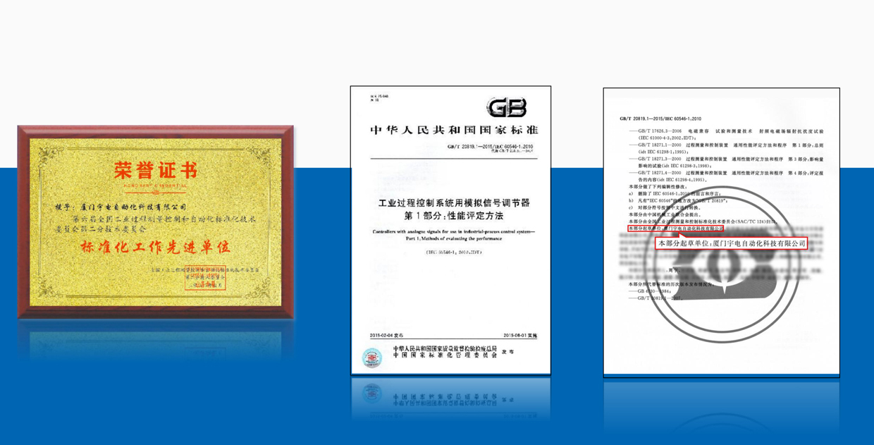 宇電積極參與國家標(biāo)準(zhǔn)制定工作,主持起草了《GB/T 20819.1-2015 工業(yè)過程控制系統(tǒng)模擬信號調(diào)節(jié)器》標(biāo)準(zhǔn),該標(biāo)準(zhǔn)為溫控器調(diào)節(jié)器最主要的國家標(biāo)準(zhǔn);并參與《溫度測量設(shè)備電子數(shù)據(jù)交換用屬性列表》等50多項(xiàng)國家標(biāo)準(zhǔn)制定。