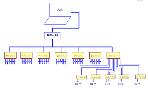 整個空調(diào)數(shù)據(jù)采集、監(jiān)控系統(tǒng)由一臺上位PC機、1個宇電RS232/RS485轉換器、7臺AI人工智能高精度6路巡檢儀、37個鉑熱電阻Pt100、4個流量傳感器及一個壓差變送器組成。利用具有通訊功能的AI-706M6路巡檢儀對現(xiàn)場數(shù)據(jù)進行采集,測量精度為0.2級。在巡檢儀上可直接顯示采集的數(shù)據(jù),并通過RS-485串行通訊和上位機進行通訊,實現(xiàn)37個通道溫度、4個通道流量及1個通道壓差的集中監(jiān)控。AI調(diào)節(jié)器上的所有參數(shù)可以在上位機中顯示,也可用上位機設定下載。