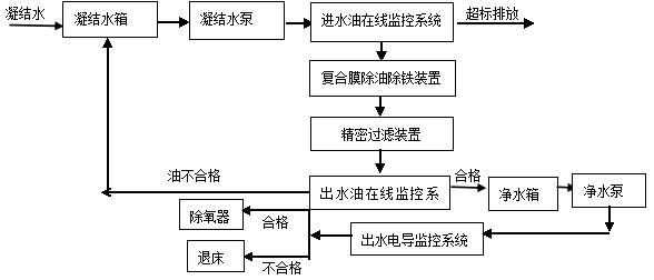 工藝流程:控制外來凝結水進入凝結水箱,有凝結水泵經過除油除鐵、過濾系統(tǒng),對合格的水進入凈水箱,由凈水泵打入工藝系統(tǒng)管網中,對于不合格的再循環(huán)回收。
