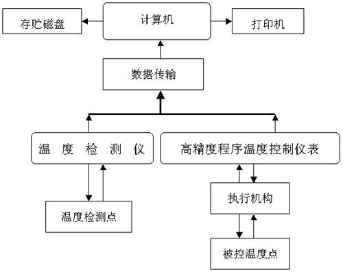 為達(dá)到上述生產(chǎn)工藝要求,系統(tǒng)采用各控制點分別采用單點高精度控制器進(jìn)行單獨控制,各參數(shù)點分別采用單獨的數(shù)據(jù)采集設(shè)備進(jìn)行單獨采集,將所有數(shù)據(jù)傳送至中心計算機(jī)進(jìn)行集中顯示、分析和處理。系統(tǒng)結(jié)構(gòu)如圖所示: